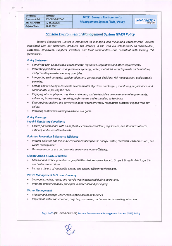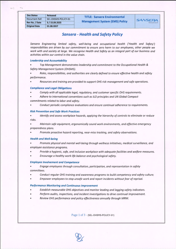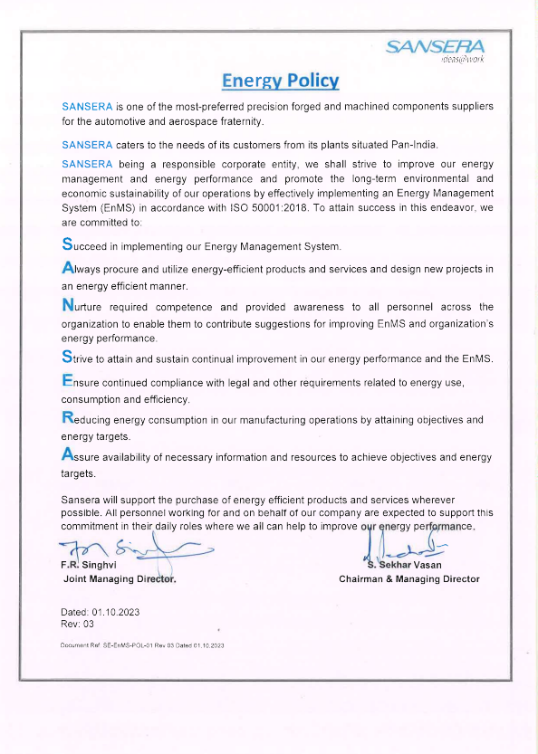 General Policies Sansera Quality PolicyView Policy Sansera EMS PolicyView Policy Sansera OHSMS PolicyView Policy Sansera Energy PolicyView PolicySansera Conflict Mineral PolicyView PolicySansera Supplier Sustainability PolicyView PolicySansera Anti-Bribery PolicyView PolicySansera Whistle- Blowing PolicyView PolicySansera Supplier Responsible Sourcing of Natural Raw Materials PolicyView PolicySansera EOHSM PolicyView PolicySansera Business Ethics, Working condition and Human Rights Policy Guideline To Enhance SustainabilityView PolicySansera Environment, Health and Safety Policy guideline to Enhance SustainabilityView Policy